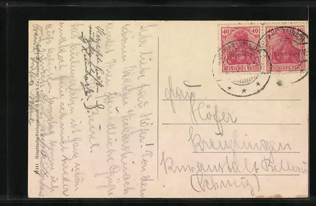 Personenbezogene Daten auf der Rückseite der Karte wurden durch blauen Textmarker unkenntlich gemacht. Die blauen Stellen sind auf die Vorderseite durchgeweicht und wirken sich negativ auf das Postkartenfoto aus