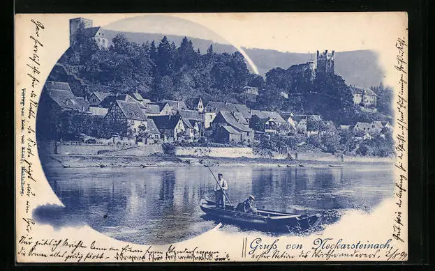 AK Neckarsteinach, Ortsansicht mit Bootspartie