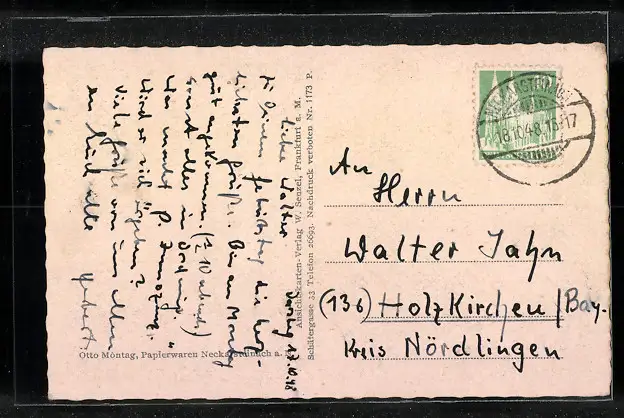 Personenbezogene Daten auf der Rückseite der Karte wurden durch blauen Textmarker unkenntlich gemacht. Die blauen Stellen sind auf die Vorderseite durchgeweicht und wirken sich negativ auf das Postkartenfoto aus