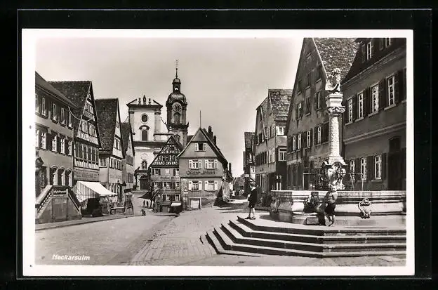 AK Neckarsulm, Ortspartie mit Denkmal und Kirche