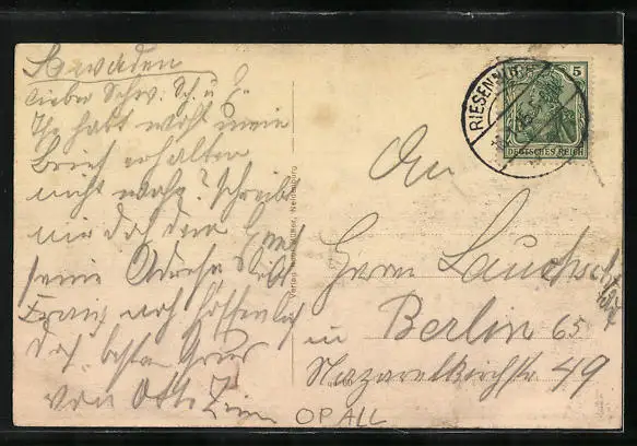 Personenbezogene Daten auf der Rückseite der Karte wurden durch blauen Textmarker unkenntlich gemacht. Die blauen Stellen sind auf die Vorderseite durchgeweicht und wirken sich negativ auf das Postkartenfoto aus