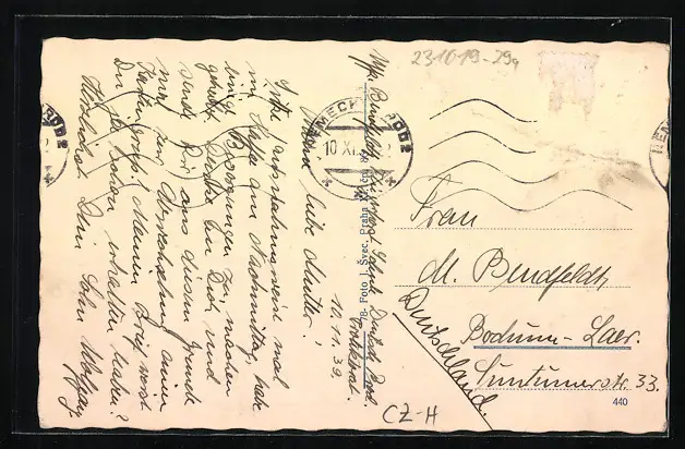 Personenbezogene Daten auf der Rückseite der Karte wurden durch blauen Textmarker unkenntlich gemacht. Die blauen Stellen sind auf die Vorderseite durchgeweicht und wirken sich negativ auf das Postkartenfoto aus
