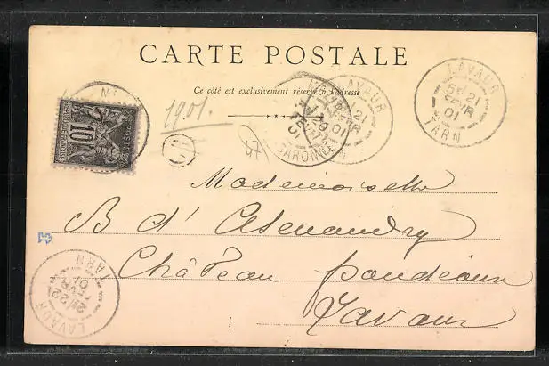 gelaufen 1901, Ecken bestoßen, leicht fleckig, sonst guter Zustand