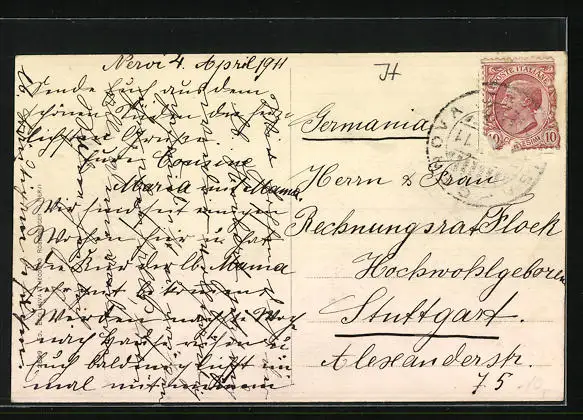 Personenbezogene Daten auf der Rückseite der Karte wurden durch blauen Textmarker unkenntlich gemacht. Die blauen Stellen sind auf die Vorderseite durchgeweicht und wirken sich negativ auf das Postkartenfoto aus