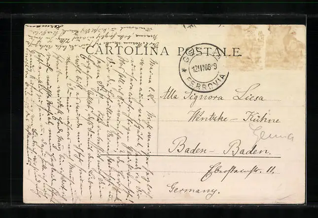 gelaufen 1908, Briefmarke entfernt, Eckknick und kleiner Einriss rechts unten, guter Zustand