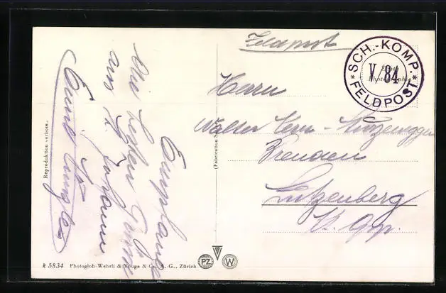 Personenbezogene Daten auf der Rückseite der Karte wurden durch blauen Textmarker unkenntlich gemacht. Die blauen Stellen sind auf die Vorderseite durchgeweicht und wirken sich negativ auf das Postkartenfoto aus