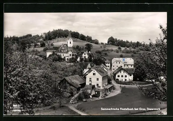 AK Nestelbach, Ortsansicht mit Kirche im Sommer
