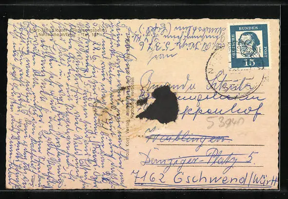 Personenbezogene Daten auf der Rückseite der Karte wurden durch blauen Textmarker unkenntlich gemacht. Die blauen Stellen sind auf die Vorderseite durchgeweicht und wirken sich negativ auf das Postkartenfoto aus