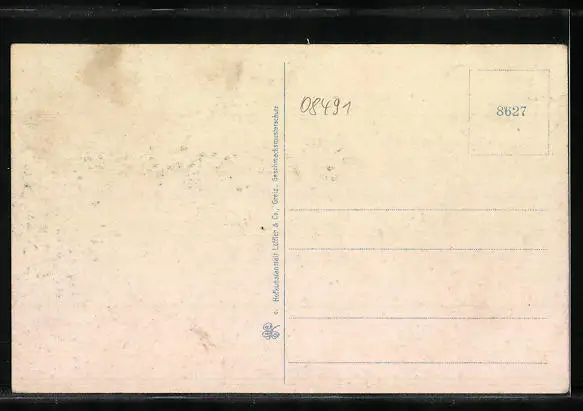Personenbezogene Daten auf der Rückseite der Karte wurden durch blauen Textmarker unkenntlich gemacht. Die blauen Stellen sind auf die Vorderseite durchgeweicht und wirken sich negativ auf das Postkartenfoto aus