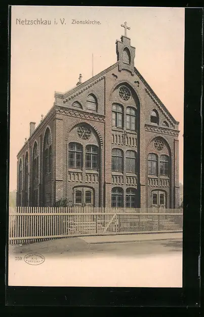 AK Netzschkau i. V., Zionskirche mit Strassenpartie