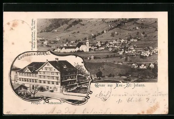 AK Neu-St. Johann, Gasthaus zum Schäfli und Panorama