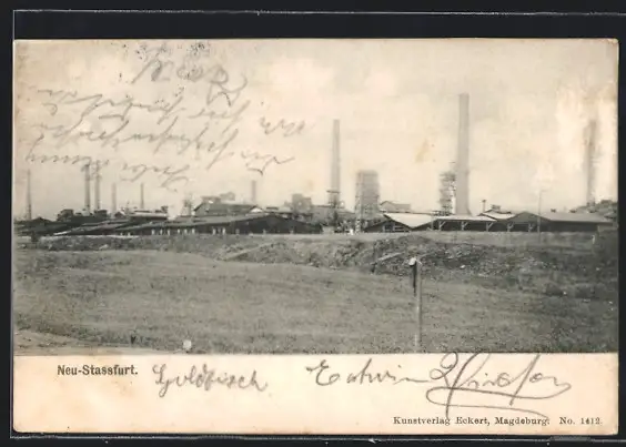 AK Neu-Stassfurt, Ortspartie mit Fabrik