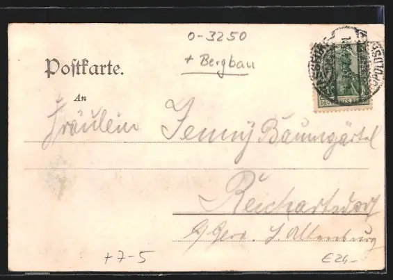 Personenbezogene Daten auf der Rückseite der Karte wurden durch blauen Textmarker unkenntlich gemacht. Die blauen Stellen sind auf die Vorderseite durchgeweicht und wirken sich negativ auf das Postkartenfoto aus