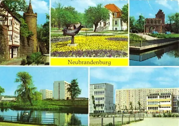 Ansichtskarte Neubrandenburg 5 Abb., Wiekhaus und Mönchenturm, Im Stadtpark, Treptower Tor, Am Schwanenteich, Erich-Weinert- und Friedrich-Wolf-Oberschule, In der Oststadt Erhaltung II, Ecken und Kanten etwas angestossen, obere rechte Ecke bügig postalisch gelaufen, gestempelt: Stempel unleserlich Druckvermerk: 1979 Herstellungsland: DDR Verlag: Bild und Heimat Reichenbach - 01 03 0050