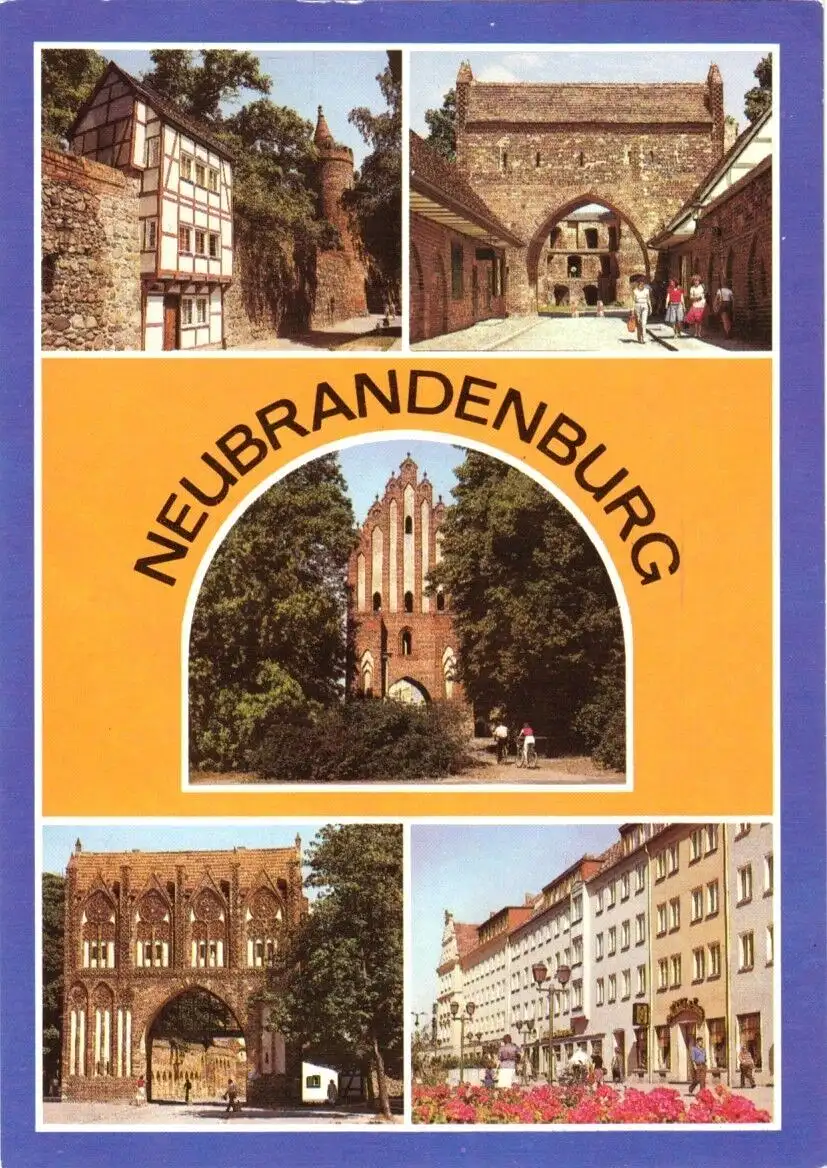 Ansichtskarte Neubrandenburg fünf Abb., gestaltet Wiekhaus mit Fangelturm, Friedländer Tor, Neues Tor, Stargarder Vortor, Boulevard Turmstr. Erhaltung I-II ungelaufen Druckvermerk: 1989 Herstellungsland: DDR Verlag: Bild und Heimat, Reichenbach i. V. - 01 03 0321/31
