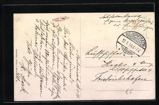 Personenbezogene Daten auf der Rückseite der Karte wurden durch blauen Textmarker unkenntlich gemacht. Die blauen Stellen sind auf die Vorderseite durchgeweicht und wirken sich negativ auf das Postkartenfoto aus