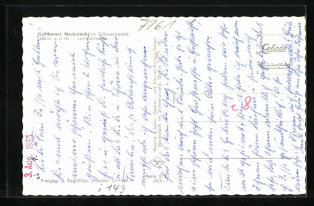 Personenbezogene Daten auf der Rückseite der Karte wurden durch blauen Textmarker unkenntlich gemacht. Die blauen Stellen sind auf die Vorderseite durchgeweicht und wirken sich negativ auf das Postkartenfoto aus