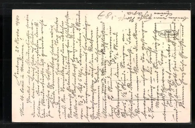 Personenbezogene Daten auf der Rückseite der Karte wurden durch blauen Textmarker unkenntlich gemacht. Die blauen Stellen sind auf die Vorderseite durchgeweicht und wirken sich negativ auf das Postkartenfoto aus