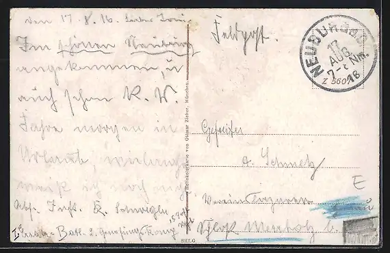 Personenbezogene Daten auf der Rückseite der Karte wurden durch blauen Textmarker unkenntlich gemacht. Die blauen Stellen sind auf die Vorderseite durchgeweicht und wirken sich negativ auf das Postkartenfoto aus