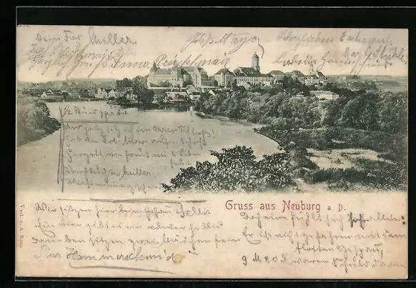 AK Neuburg a. D., Totalansicht des Ortes mit Gewässer
