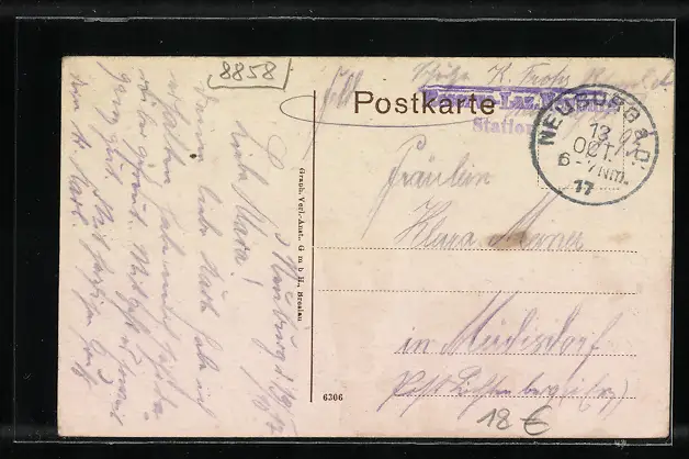 Personenbezogene Daten auf der Rückseite der Karte wurden durch blauen Textmarker unkenntlich gemacht. Die blauen Stellen sind auf die Vorderseite durchgeweicht und wirken sich negativ auf das Postkartenfoto aus