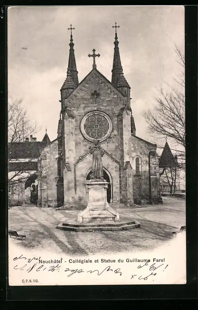 AK Neuchâtel, Collégiale et Statue du Guillaume Farel