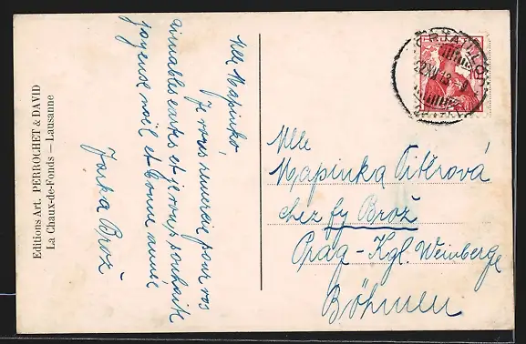 Personenbezogene Daten auf der Rückseite der Karte wurden durch blauen Textmarker unkenntlich gemacht. Die blauen Stellen sind auf die Vorderseite durchgeweicht und wirken sich negativ auf das Postkartenfoto aus
