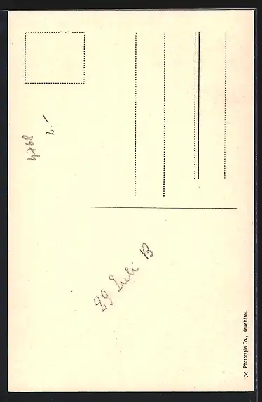 Personenbezogene Daten auf der Rückseite der Karte wurden durch blauen Textmarker unkenntlich gemacht. Die blauen Stellen sind auf die Vorderseite durchgeweicht und wirken sich negativ auf das Postkartenfoto aus