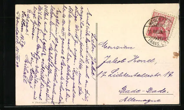 alte Ansichtskarte, gelaufen 1909, Abriebspur, Randschaden u. Einriss li. oben, guter Zustand