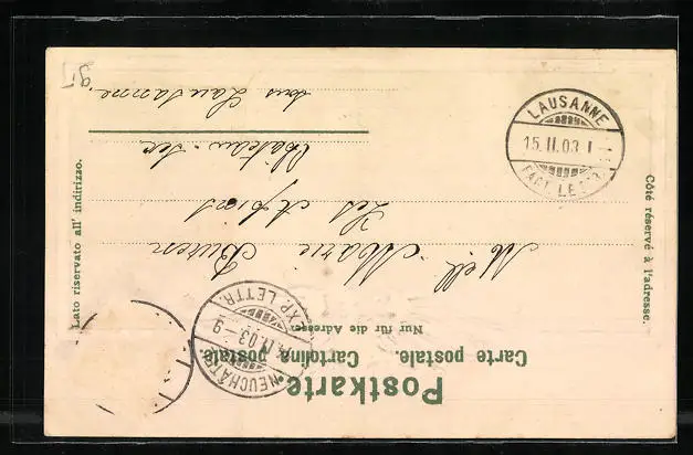 alte Ansichtskarte, gelaufen 1903, Briefmarke entfernt, rückseitig Oberflächenschaden, guter Zustand