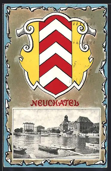 AK Neuchatel, Teilansicht der Stadt, Stadt-Wappen