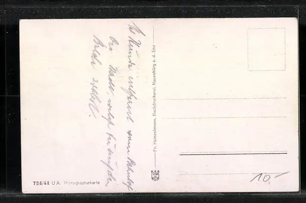 Personenbezogene Daten auf der Rückseite der Karte wurden durch blauen Textmarker unkenntlich gemacht. Die blauen Stellen sind auf die Vorderseite durchgeweicht und wirken sich negativ auf das Postkartenfoto aus