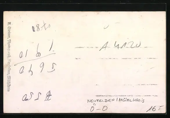 Personenbezogene Daten auf der Rückseite der Karte wurden durch blauen Textmarker unkenntlich gemacht. Die blauen Stellen sind auf die Vorderseite durchgeweicht und wirken sich negativ auf das Postkartenfoto aus
