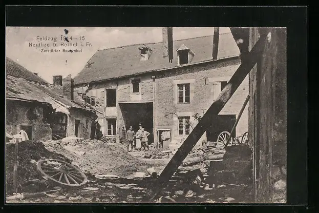 AK Neuflize, zerstörter Bauernhof mit Soldaten