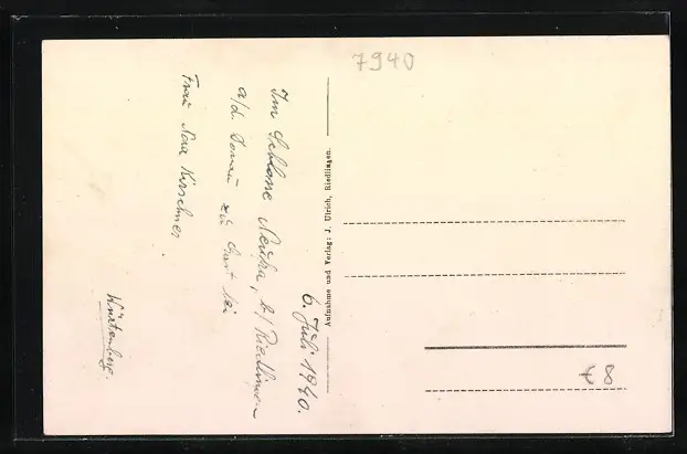 Personenbezogene Daten auf der Rückseite der Karte wurden durch blauen Textmarker unkenntlich gemacht. Die blauen Stellen sind auf die Vorderseite durchgeweicht und wirken sich negativ auf das Postkartenfoto aus