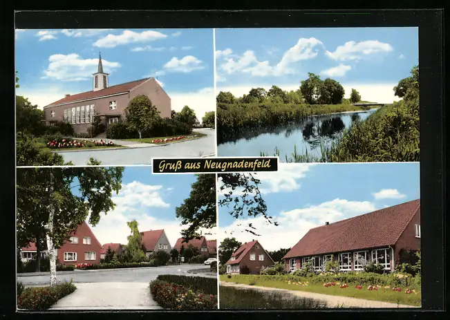 AK Neugnadenfeld, Flusspartie, Wohnhäuser an Strassenpartie, Kirche