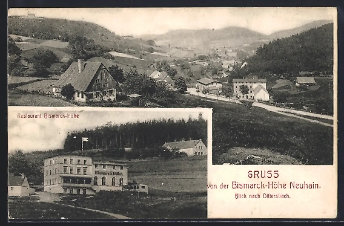 AK Neuhain bei Dittersbach, Restaurant Bismarck-Höhe, Blick ins Tal
