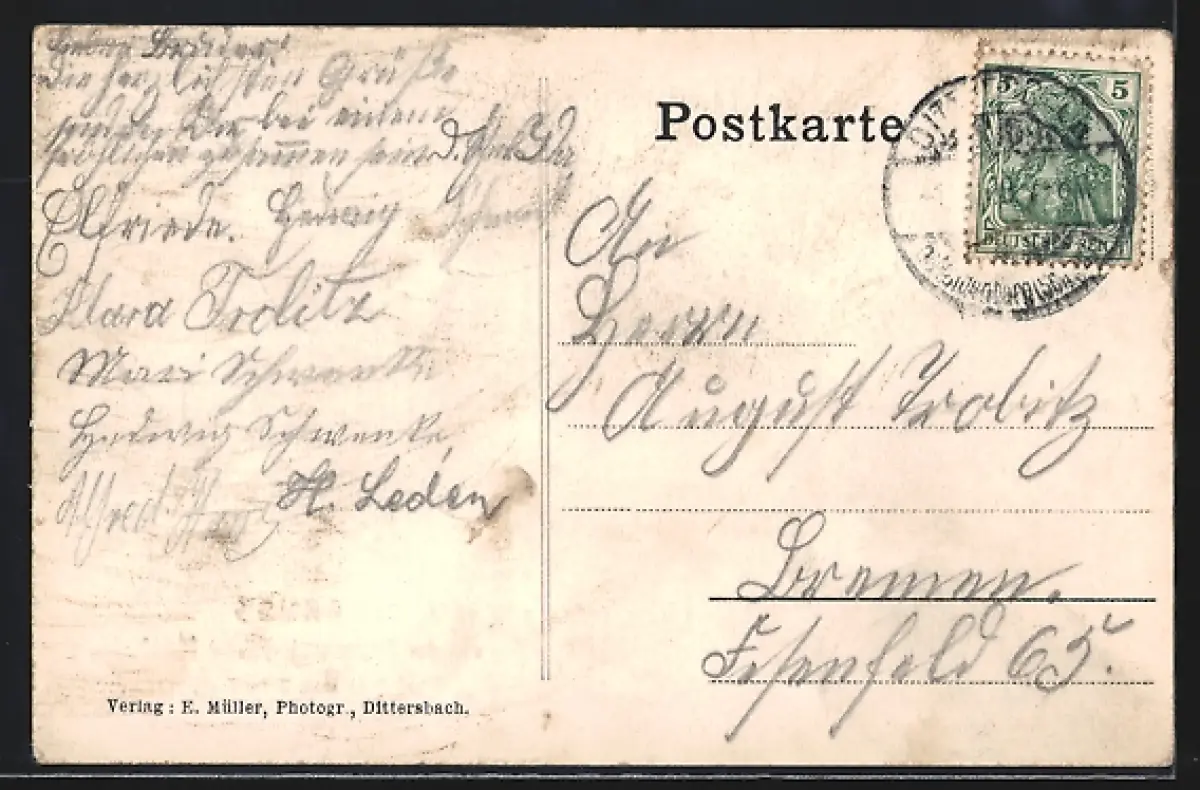 Personenbezogene Daten auf der Rückseite der Karte wurden durch blauen Textmarker unkenntlich gemacht. Die blauen Stellen sind auf die Vorderseite durchgeweicht und wirken sich negativ auf das Postkartenfoto aus