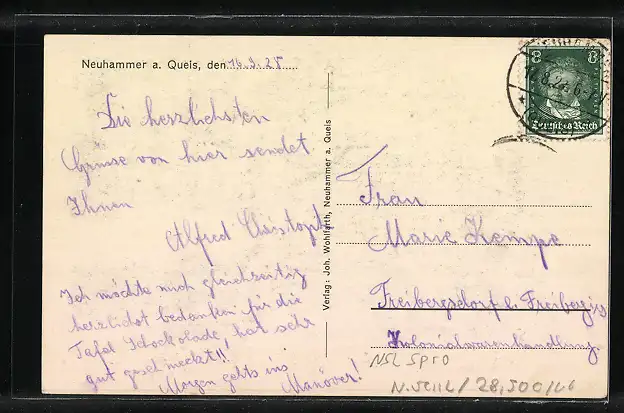 Personenbezogene Daten auf der Rückseite der Karte wurden durch blauen Textmarker unkenntlich gemacht. Die blauen Stellen sind auf die Vorderseite durchgeweicht und wirken sich negativ auf das Postkartenfoto aus