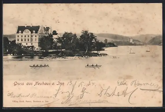 AK Neuhaus / Inn, Gebäude am Inn, Ruderboote