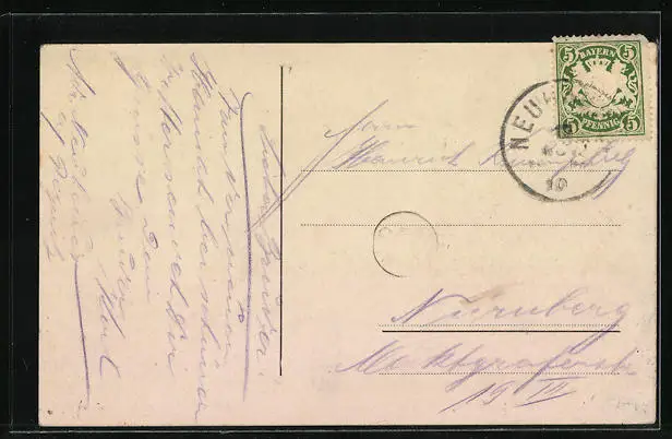Personenbezogene Daten auf der Rückseite der Karte wurden durch blauen Textmarker unkenntlich gemacht. Die blauen Stellen sind auf die Vorderseite durchgeweicht und wirken sich negativ auf das Postkartenfoto aus