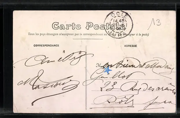 Personenbezogene Daten auf der Rückseite der Karte wurden durch blauen Textmarker unkenntlich gemacht. Die blauen Stellen sind auf die Vorderseite durchgeweicht und wirken sich negativ auf das Postkartenfoto aus