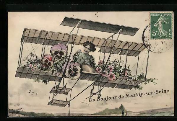 AK Neuilly-sur-Seine, Frau mit Blumen im Flugzeug