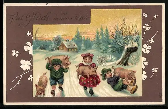 AK Neujahr, Kinder tragen Schweine durch den Schnee
