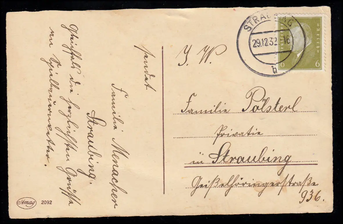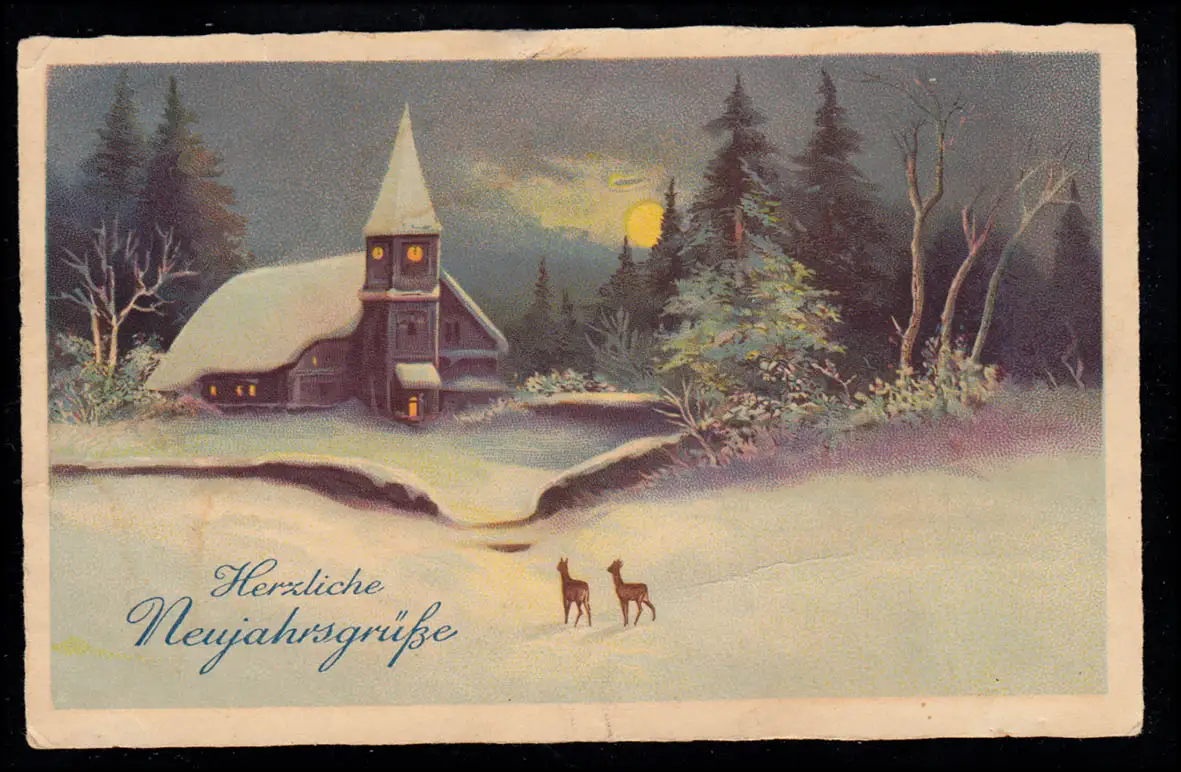 AK Neujahr: Winterlandschaft mit Kirche und Rehen bei Nacht, STRAUBING 29.12.32