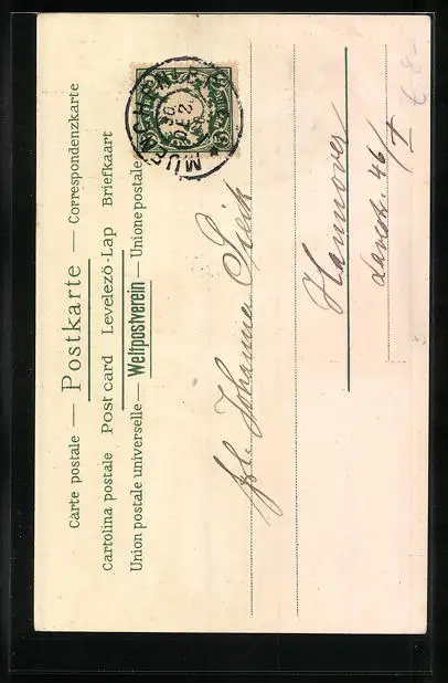 Personenbezogene Daten auf der Rückseite der Karte wurden durch blauen Textmarker unkenntlich gemacht. Die blauen Stellen sind auf die Vorderseite durchgeweicht und wirken sich negativ auf das Postkartenfoto aus
