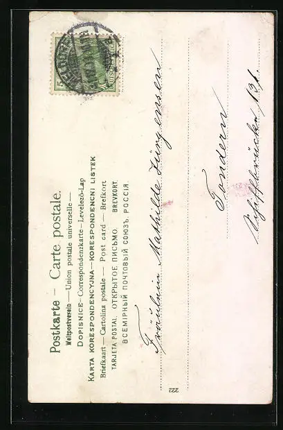 Personenbezogene Daten auf der Rückseite der Karte wurden durch blauen Textmarker unkenntlich gemacht. Die blauen Stellen sind auf die Vorderseite durchgeweicht und wirken sich negativ auf das Postkartenfoto aus