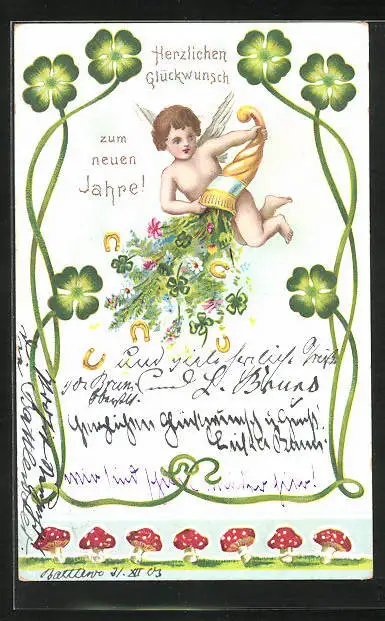 AK Neujahrsengel mit Blumen und Kleeblättern im Horn, Neujahrsgruss