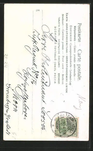 Personenbezogene Daten auf der Rückseite der Karte wurden durch blauen Textmarker unkenntlich gemacht. Die blauen Stellen sind auf die Vorderseite durchgeweicht und wirken sich negativ auf das Postkartenfoto aus