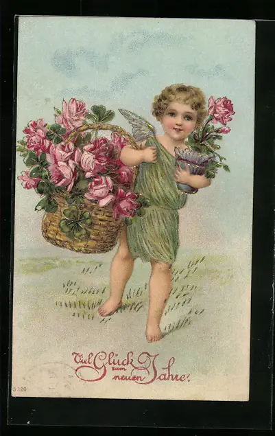 AK Neujahrsengel mit Blumenkorb